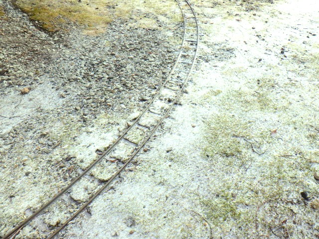 ガレージのシャッタを半分だけ上げて、バンドソーを外に引き出し、線路を切断しているところ。この長いカーブが、鉱山線(炭坑線とも)の最後の1本になります。